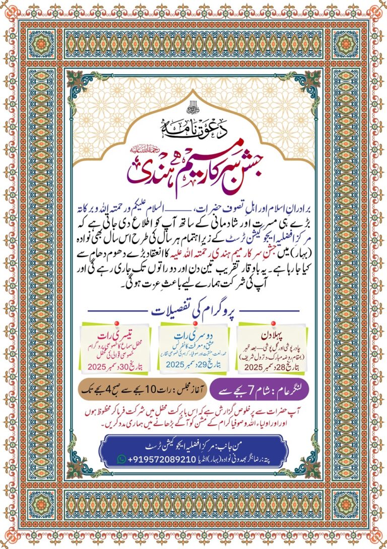 🌹💐 دعوت نامہ 📜✨ 🌙⭐ جشنِ سرکار میم ہندی رحمتہ اللہ علیہ 🌙⭐ 😊🎉 برادرانِ اسلام اور اہلِ تصوف حضرات، السلام علیکم …
